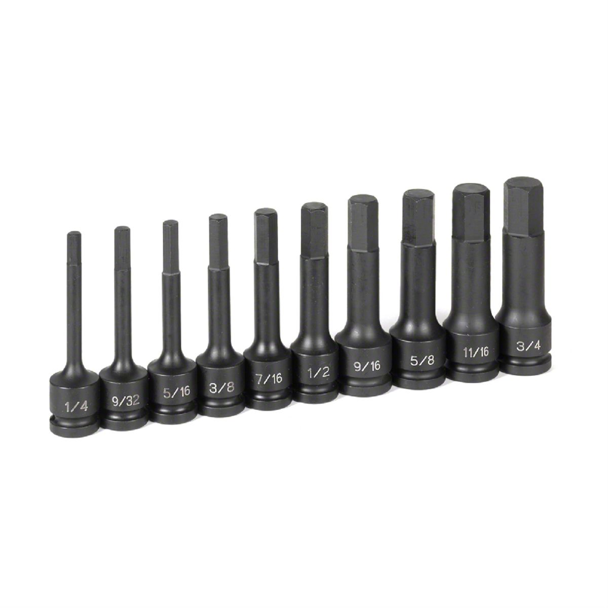Impact Hex Bit Socket Set, 1/2" Drive, 10 Piece, 1/4" to 3/4", 4" Long, in Blow Molded Case. Our impact sockets grip the fastener across a broader contact area, reducing chance of rounding off fasteners.  They also allow up to 20% more torque to be applied than on other impact sockets.  The shift in pressure allows us to reduce the socket wall thickness, increasing access to tight areas.
