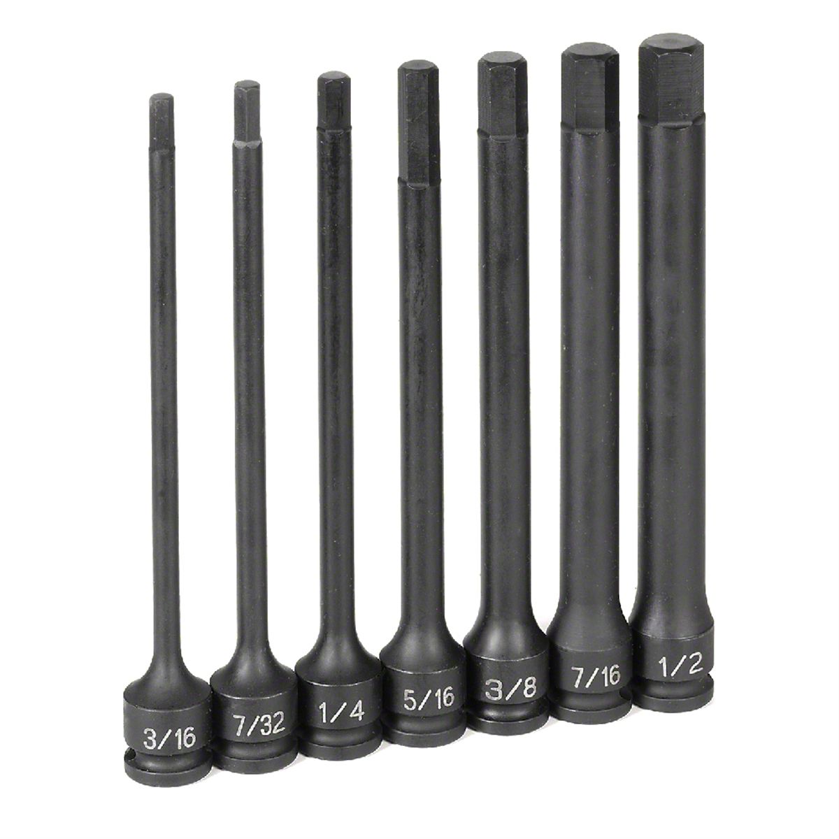 Impact Hex Bit Socket Set, 3/8 in.; Drive, 7 Piece, H3/16 in.; to 1/2 in.;, 6 in.; Long, in Blow Molded Case. Our impact sockets grip the fastener across a broader contact area, reducing chance of rounding off fasteners. They also allow up to 20% more torque to be applied than on other impact sockets. The shift in pressure allows us to reduce the socket wall thickness, increasing access to tight areas.