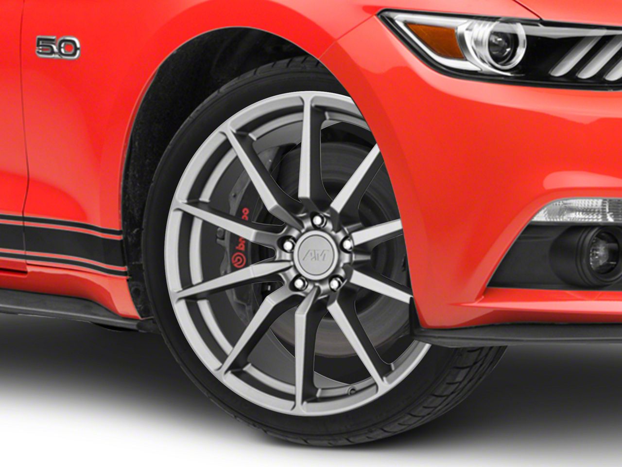 The 19x8.5 American Muscle Wheels GT350 Style Charcoal Wheel is completed in a dark charcoal hue that is lighter than the standard "Henry Ford" black.