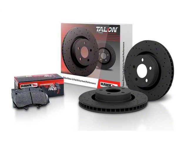 Black Steel Rotors. The Talon Cross-Drilled and Slotted Brake Rotor with HPS 5.0 Pad Kit from Hawk Performance is meticulously built from powder-coated die-cast steel that has been deeply CNC-drilled and refined for improved performance and longevity to ensure lifelong functioning.