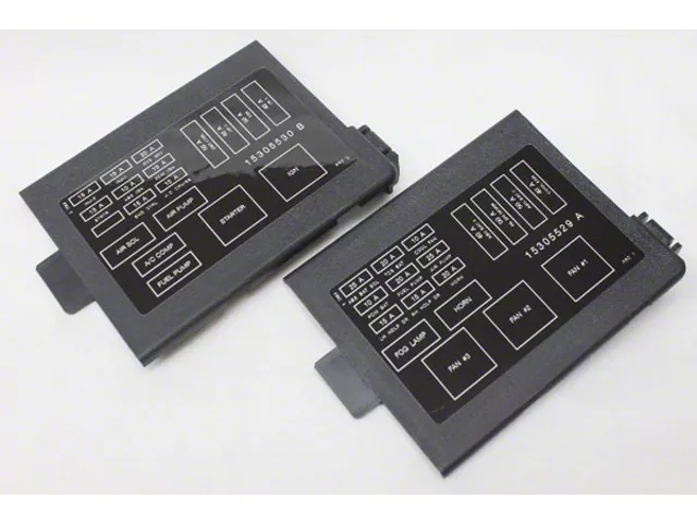 Construction and Features. These covers are finished in matte black and include matte white finish diagram decals for easy identification of fuses. Built with durability in mind, they match the original GM part number and provide a reliable replacement option for worn or damaged fuse box covers.