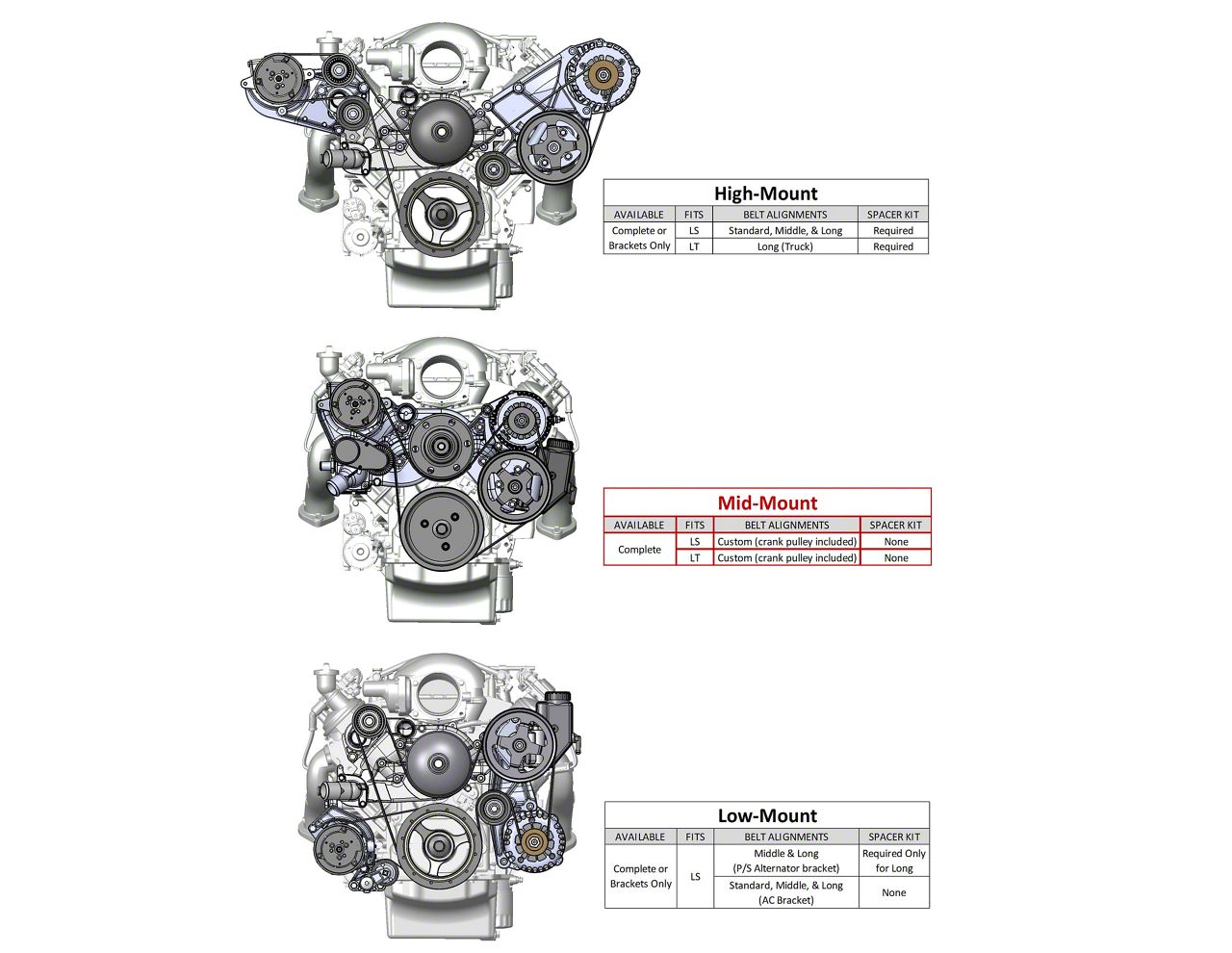 Efficient Weight Distribution. Designed with precision engineering and uncompromising quality, the Holley LS Mid-Mount Complete Accessory System takes your vehicle's performance to new heights. Say goodbye to bulky, cluttered engine bays and hello to a clean and organized setup. This accessory system boasts a mid-mount configuration, optimizing weight distribution and enhancing overall balance.