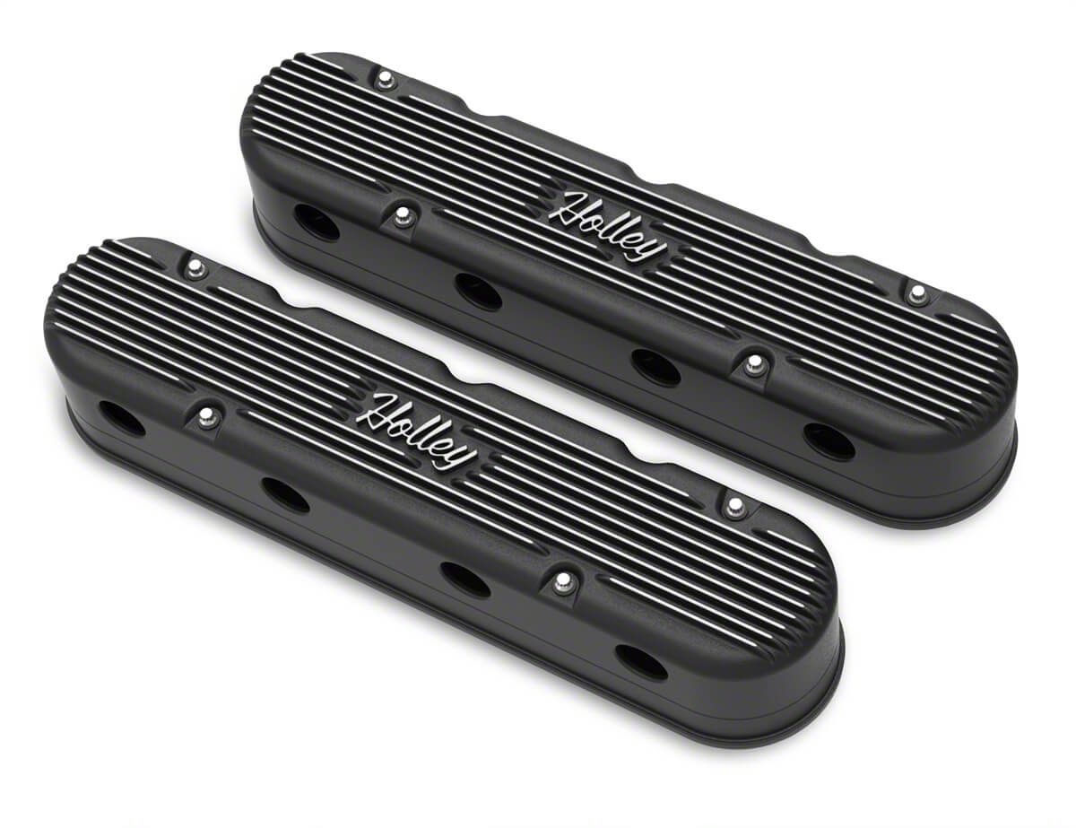 Construction. Made from cast aluminum, these Holley Performance Valve Covers feature an OE style baffle and ventilation system. They'll clear 0.75-inch lift cam with stock style rocker arms. There is a satin black finish and the pair of covers comes with a low-profile billet oil fill cap.
