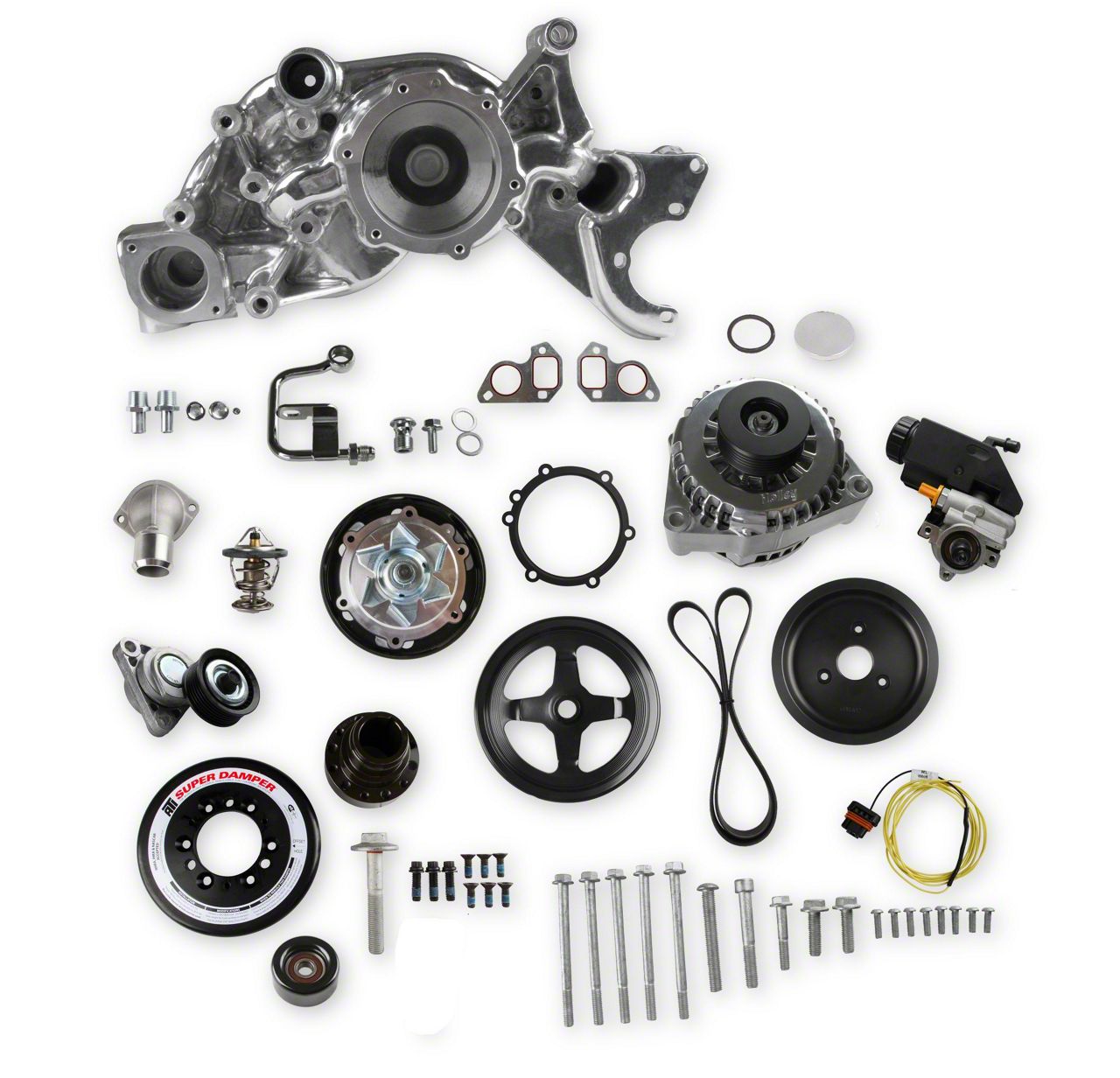 Holley's Mid-Mount Accessory Drive System is now offered for the serious racer in mind. If you need a front drive system for your LS engine racecar, they are now available without air conditioning and power steering depending upon your needs! Holley's Premium Mid-Mount complete accessory system has all accessories pulled in tighter than other accessory drives. At the heart of the system is a "bracketless" design (Patent Pending), where the accessories bolt directly to the water pump for a clean, integrated form. The design offers superb engine visibility to show off your horsepower, not your accessories. Among the many swap friendly features are bottom heater outlets for clearance in tight applications. The Holley designed alternator is just as innovative. This premium alternator utilizes 6-phase technology as found on the C7 Corvette. The water pump also shares its design efficiencies with that of the C7 Corvette. The compact and reliable Type II P/S pump with baffled reservoir are also integrated.