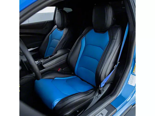 Stylish Seat Protection. The Kustom Interior Premium Artificial Leather Front and Rear Seat Covers offer a custom fit for RECARO seats in your 2016-2024 Camaro Coupe. Designed to enhance comfort and protection, these seat covers feature a sleek black finish with striking blue accent stitching that complements your vehicle's interior.