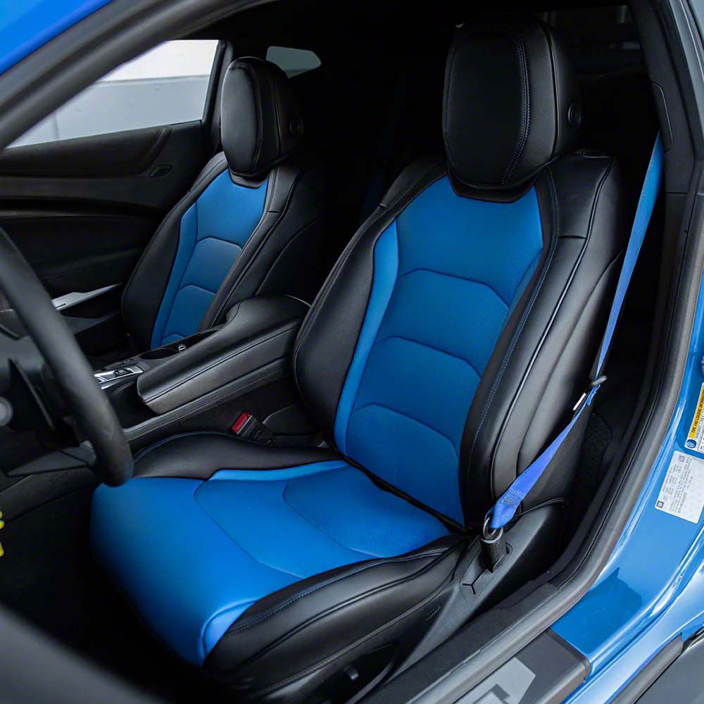 Stylish Seat Protection. The Kustom Interior Premium Artificial Leather Front and Rear Seat Covers offer a custom fit for RECARO seats in your 2016-2024 Camaro Coupe. Designed to enhance comfort and protection, these seat covers feature a sleek black finish with striking blue accent stitching that complements your vehicle's interior.
