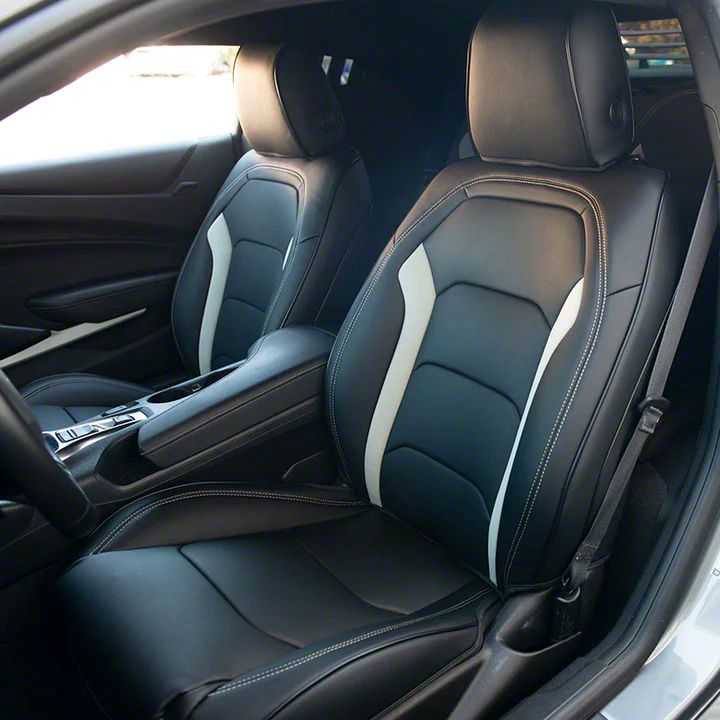 Application. The Kustom Interiors Premium Artificial Leather Front and Rear Seat Covers; Black with Gray Wing Accent fits 2016-2024 Camaro Coupe with no 1LE Competition Seat.