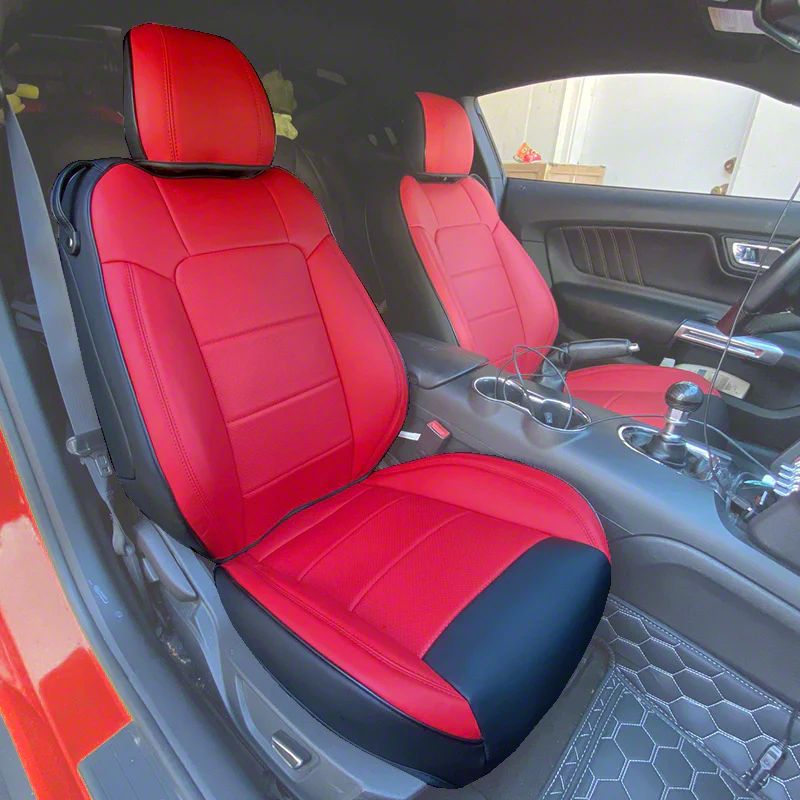 Design. The front face of these seat covers, which is black and red, gives the inside of your Mustang a distinctive and athletic appeal. Your Mustang stands out from the competition because to the striking visual appeal the contrasting colors produce. You may add your own style and a provocative statement to the inside of your Mustang by using these seat coverings.