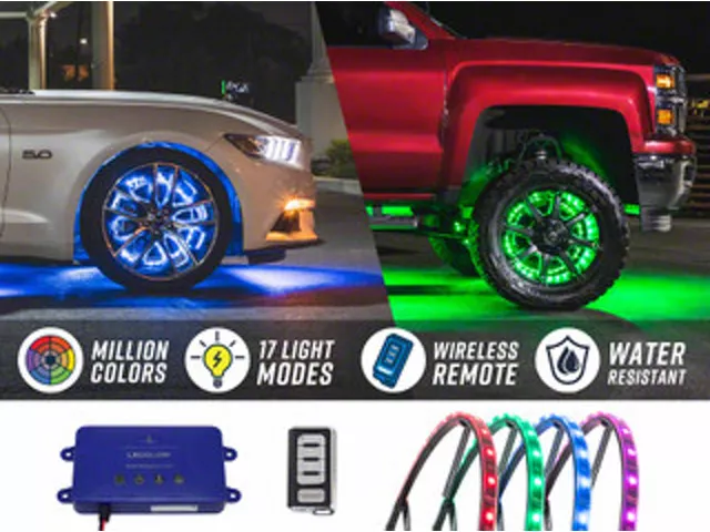 Dynamic Lighting Upgrade. The LEDGlow Million Color Wheel Ring Lighting Kit offers a vibrant and stylish enhancement for your vehicle. Featuring 17-inch wheel rings, this kit provides a dynamic lighting effect that can transform the look of your vehicle. With 17 different light modes, you can customize the illumination to suit your mood or event, making your vehicle stand out both day and night.