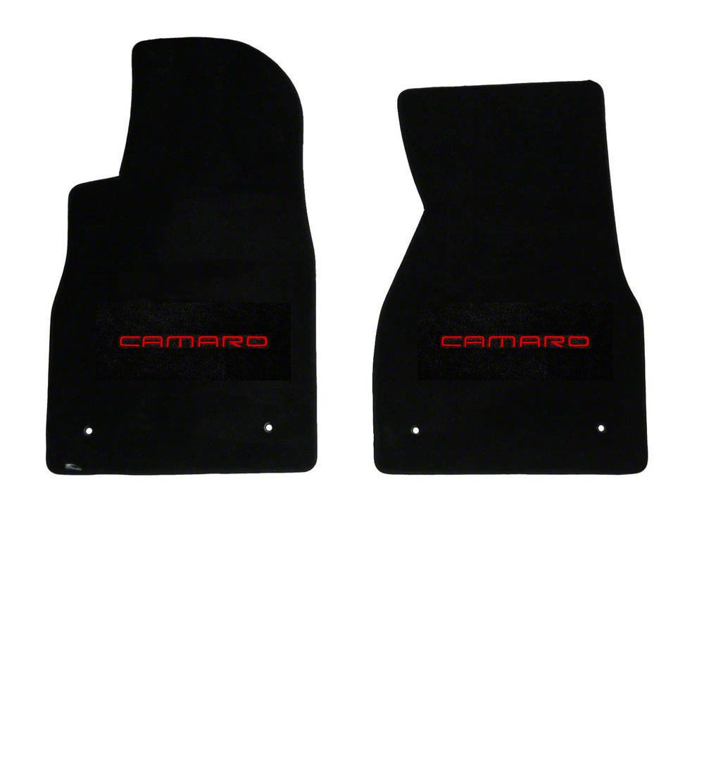 Construction and Features. Featuring a matte black finish with a racing red Camaro logo design, these floor mats are crafted from 5/16-inch cut-pile carpet with high quality velour binding. The custom fit ensures they cover a larger floor area compared to other mats, providing maximum protection. The grommet/hook design prevents slippage, while the non-skid rubber TractionBac backing offers moisture protection and added stability. As officially licensed GM products, these mats guarantee authenticity and superior quality.