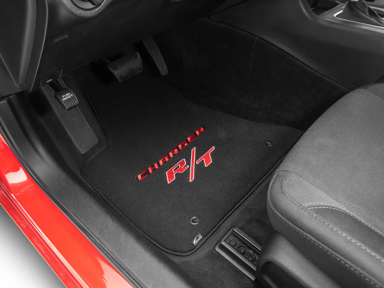 Application. These Lloyd Velourtex Front Floor Mats with Red R/T Logo; Black are designed to fit 2011-2023 RWD Dodge Charger models. Sold as a set of two Front Mats.