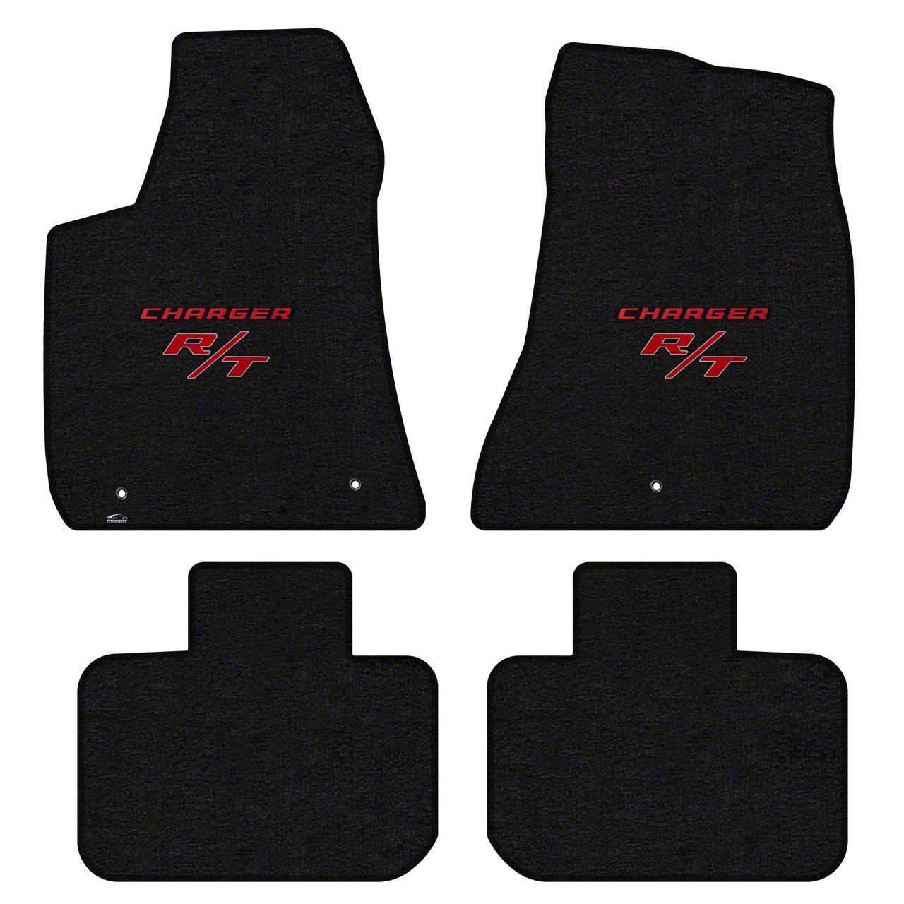 Custom Styling. Show your love for your Dodge Charger with these Black Lloyd Velourtex Floor Mats. Featuring the R/T logo embroidered in red on the front mats, these floor mats will not only protect your Charger's interior, but will also add a touch of customization to your ride.