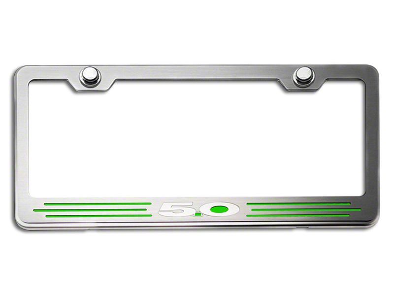 Licensed Green. Add extra eye-catching style to your tag area by upgrading to the ACC License Plate Frame with Illuminated Green Inlay and 5.0 Logo. It's an innovative high energy trim accessory that adds nothing short of polished design.