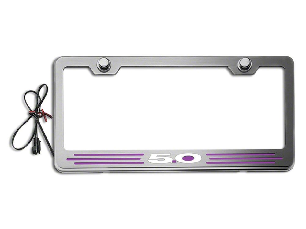 Impressive Style. If you're tired of other drivers underestimating your 2021-2025 Ford Mustang Mach-E's power because of its run-of-the-mill look, give it the serious upgrade it needs by installing ACC's License Plate Frame with 5.0 Logo Illuminated Purple Inlay. This hardcore plate frame is specifically designed to ensure your Pony's appearance backs up its unbeatable torque with a high-end, unique style that helps you stand out wherever you go. Featuring an illuminated purple inlay on the plate's lettering and lines, this plate frame draws eyes thanks to its 5.0 logo as well as its eye-catching lighting that adds a superior shine to the rear end of your Mustang Mach-E.