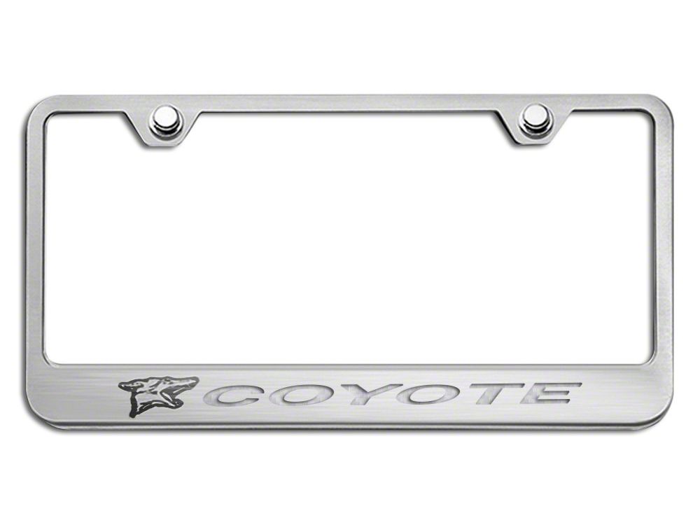 Streamlined Style. If you want to upgrade the looks of your rather boring license plate, this ACC License Plate Frame with the Coyote Logo in White Carbon Fiber Inlay is what you need. Custom-made for Ford Mustang Mach-E, this frame easily adds a streamlined but stylish look to your vehicle’s rear. The frame features a coyote head graphic and text with white inlaid color. What you get is a unique style that perfectly complements any exterior finish.