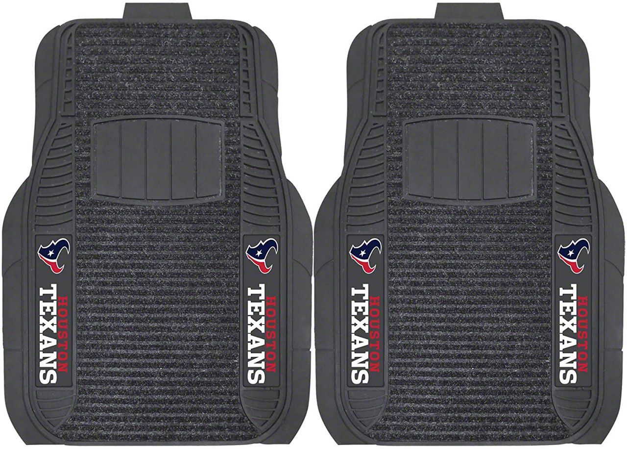 Application. These Molded Front Floor Mats with officially-licensed Houston Texans logo feature a universal design so they will fit most makes and models of vehicles. These Mats can be trimmed to fit if necessary. Sold as a set of two Mats.