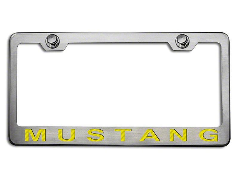Application. ACC Polished/Brushed License Plate Frame with Yellow Carbon Fiber 2005 Style Mustang Lettering is designed exclusively for all Ford Mustang Mach-E models manufactured from 2021-2025.