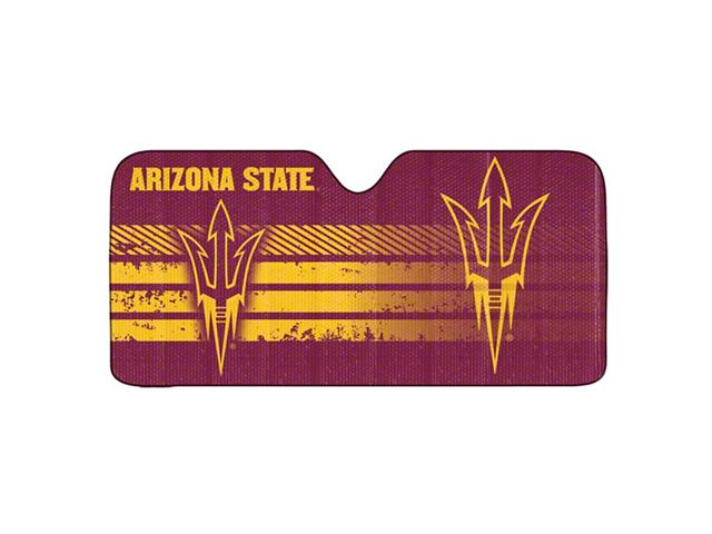 Application. This Windshield Sun Shade with Arizona State University Logo in Maroon and Gold fits universally and requires minimal adjustments.