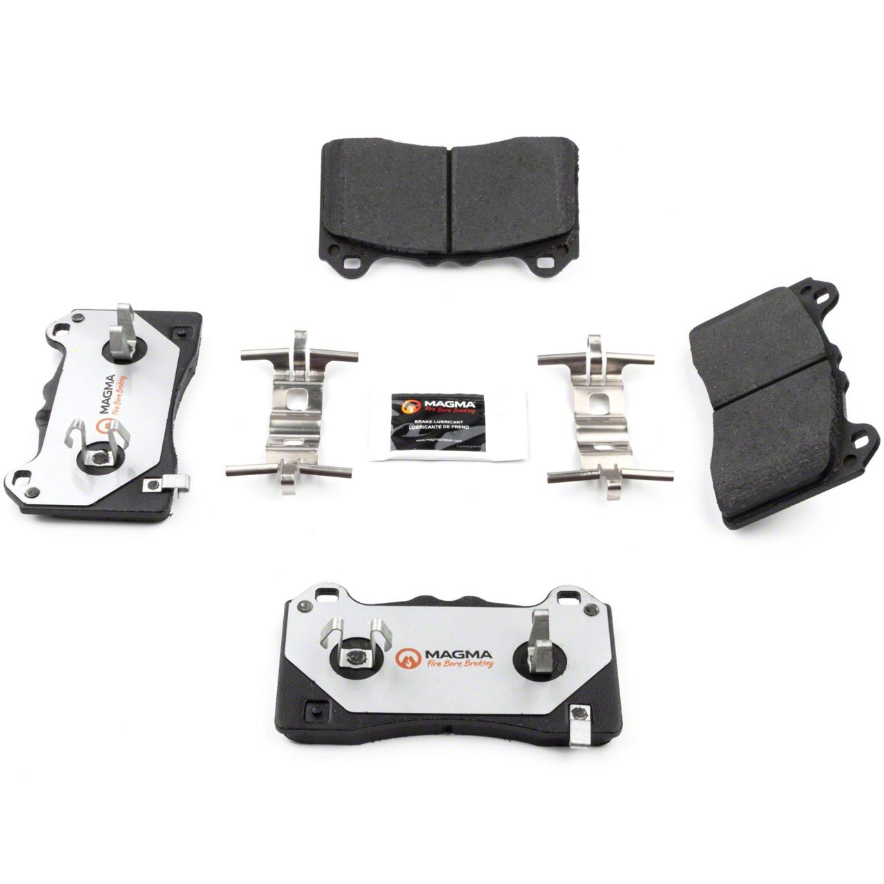 WHY MAGMA? - Today's harsh stop and go environment can create very high heat levels in your braking system which can reduce the vehicle's ability to stop. Extreme high temperatures can be reached in many braking situations such as - Stop and Go Traffic, Mountain Driving, Hauling or Towing, Emergency Stops, Spirited Driving and Long, Sustained Braking. At MAGMA Brakes, we use FIRE to fight FIRE. Our brake system components are made using advanced, state of the art techniques and treatments that ensure our brakes will stand up to the heat. MAGMA Pro-Series brake pads feature... 1. Scorched, copper free friction formulations for overall ltimate braking performance 2. Vulcanized OE style rubber core shims for unsurpassed noise suppression 3. Heat-tempered upgraded dual-coated stainless steel hardware kits to restore the brake pad to caliper interface to "like new" condition (where applicable) 4. Heat expansion OE style slots and chamfers to dissipate noise and stand up to the heat 5. High-heat resistant brake lubricant included for lubricating critical points during pad installation