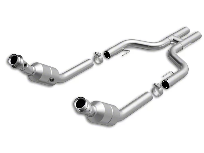 Catalytic Converters. The Magnaflow Direct-Fit OEM Grade Catted H-Pipe includes two OEM-grade catalytic converters that are 49-state federal emissions compliant. They have a stainless-steel construction and have twice the amount of precious metals as aftermarket catalytic converters for better exhaust filtration. The 2-1/2-inch piping should fit the factory exhaust.