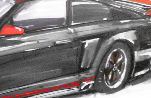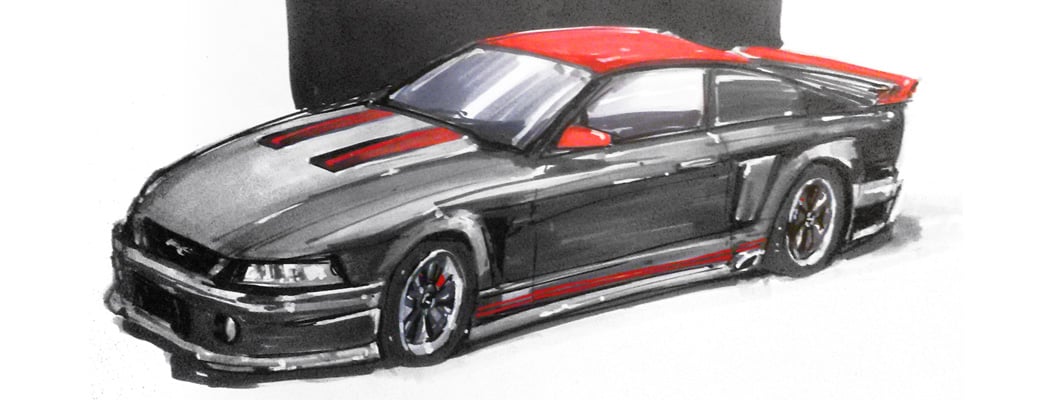 A 1999-2004 Mustang styled like a Boss 302 Laguna Seca was a unique and exciting idea and the team at AmericanMuscle quickly got to work sketching Johnathan’s vision of his dream Mustang. Taking on the black and red styling from the Laguna Seca and building in Roush side-exit exhaust, an SVT Cobra style hood, Bullitt wheels and MMD styling components, his dream New Edge Mustang started to take form. With a little over two weeks to turn his wish into reality, the AmericanMuscle crew got working on Johnathan’s Mustang.