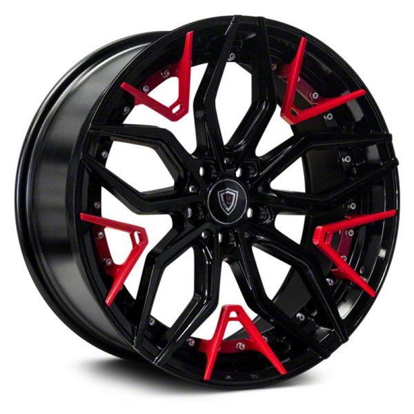 The 20x10.5 Marquee Wheels M3371 Gloss Black with Red Spoke Accents Wheel is painted in a stunning black hue, and features candy red accents for an impressive head-turning presentation.