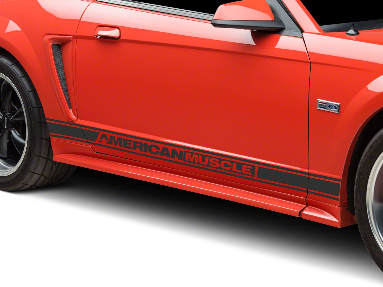 AM Retro Styling. Give your Mustang the cool retro styling of yesteryear with a set of Matte Black Mustang Rocker Stripes that feature "AmericanMuscle" Lettering. These SEC10 Matte Black Rocker Stripes will look great on any year or color Mustang.
