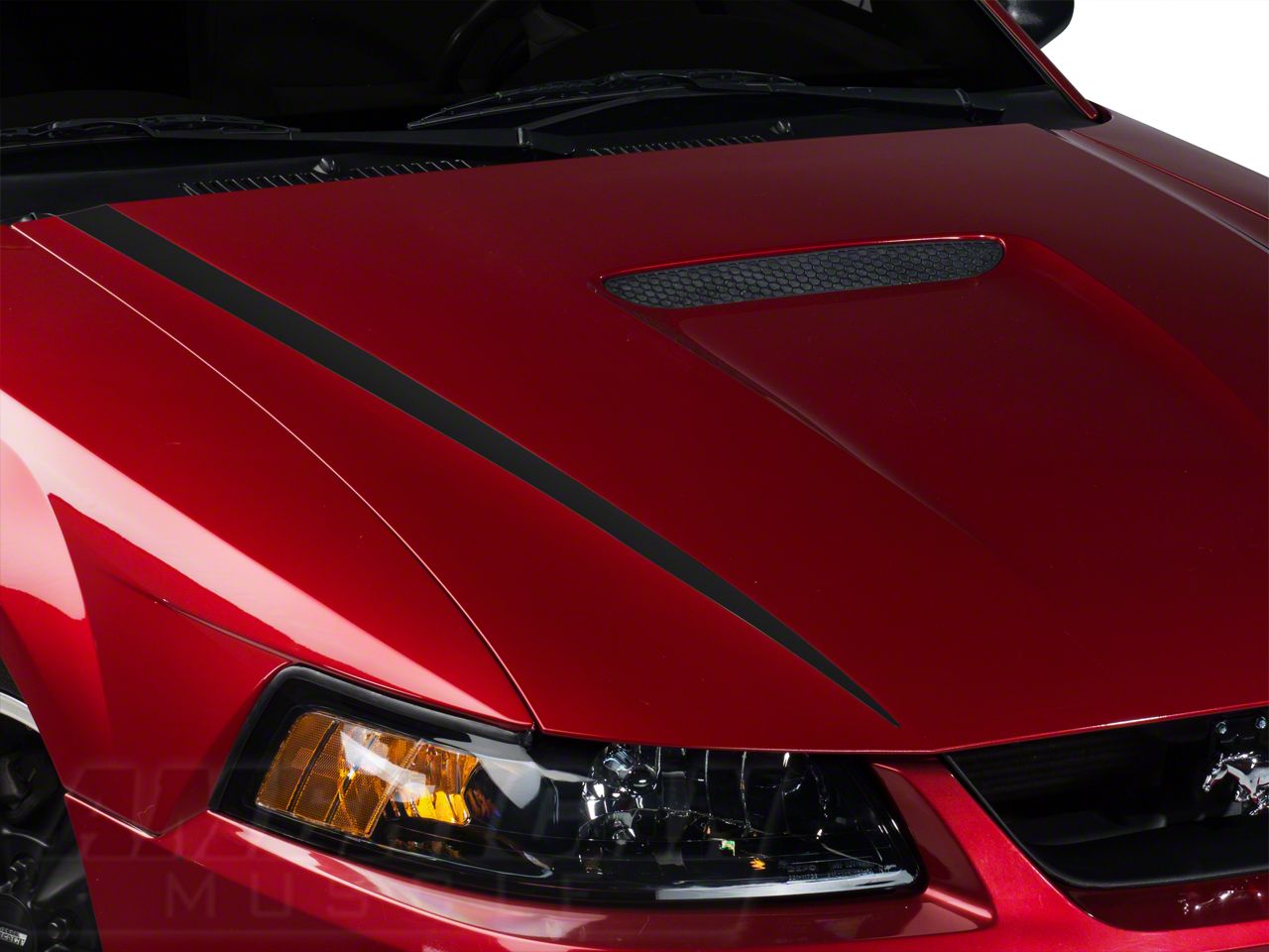 Application. These SEC10 Hood Accent Decals; Matte Black are designed to fit 1999-2004 Ford Mustang GT and 1999-2002 Ford Mustang V6 models with the original factory hood. Driver and passenger side included.