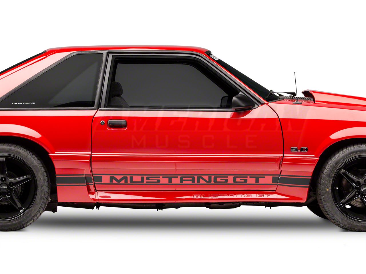 Retro Styling. Change the look of your Foxbody Mustang by adding a pair of Matte Black Rocker Stripes. Featuring Mustang GT Lettering, these Matte Black Rocker Stripes will not only look great on any 1979-1993 Mustang, but you'll be able to enjoy them for years to come.