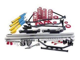 Finely Tuned. The Road and Track Suspension system has all the components needed for a full suspension replacement and update. It has stiffer springs with matched shock absorbers for improved overall handling, adjustable camber/caster plates to alignment tuning and a new panhard bar to improve cornering grip. New lower control arms are also included, as well as new urethane bushings, to improve wheel hop and give your Mustang a factory-like feel.