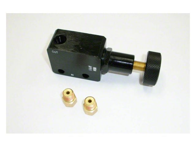 Adjustable proportioning valves are essentially pressure reducing valves and are often utilized in disc/drum, disc/disc and drum/drum braking systems. The valve is used to control front-to-rear brake pressure bias and will work for all types of vehicles. Install this valve between the distribution block and the rear flex hose in the front to rear rigid brake line. Always use tube wrenches to tighten fittings properly. Final settings of this valve will depend on your particular vehicle, and individual preference.