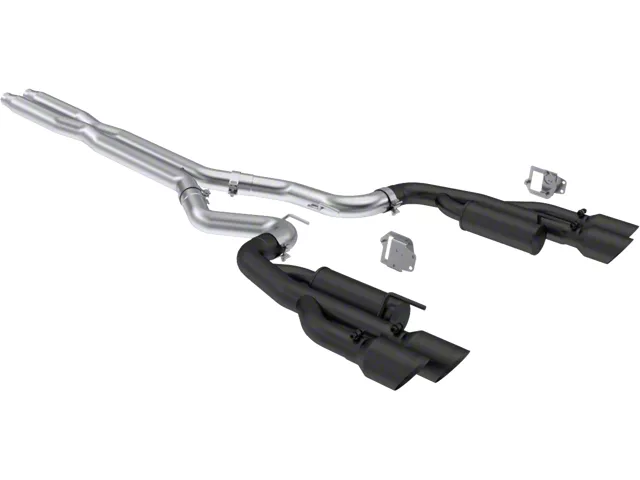Construction and Appearance. Constructed from premium aluminized steel tubing, this exhaust system boasts high-heat black powder-coating for durability and aesthetics. The black-coated stainless steel 4-inch tips are dual-walled and angled cut, providing a sleek, aggressive look that complements the Mustang GT's design.