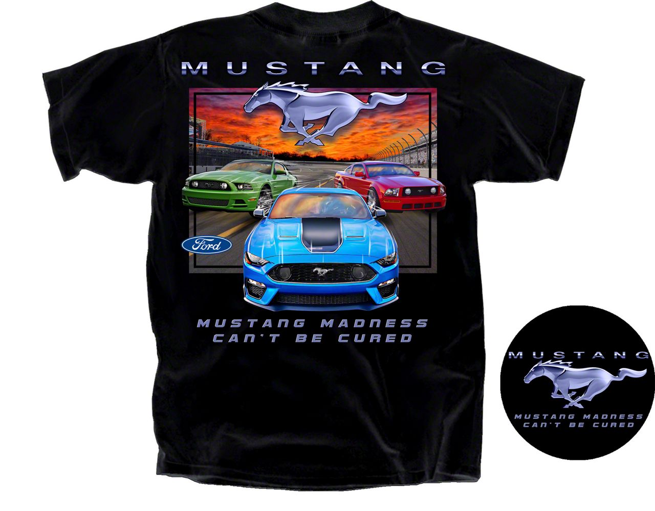 Mustang Madness T-Shirt. Jazz up your look with this Men’s Mustang Madness T-shirt in Black. This t-shirt features a Ford Mustang logo with a “Mustang Madness Can’t be Cured” statement on the front left chest. It also has a colorful illustration of a race track with red, green, and blue Mustangs on the back.