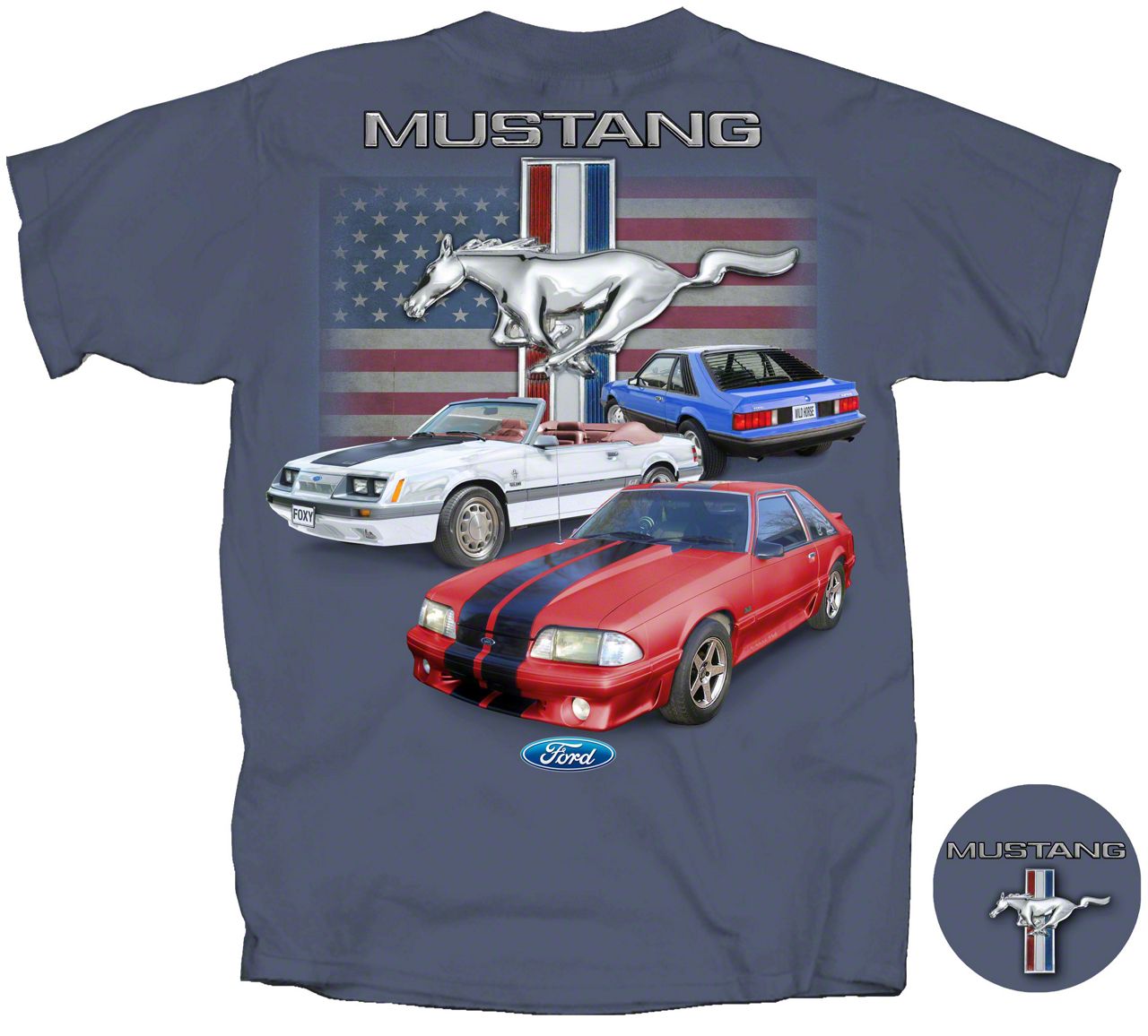 Fox Body Mustang Design. Show your love for the Fox Body Mustang with this elegant-looking Men’s Foxbody Mustang t-shirt in Indigo. This t-shirt features a small Tri-bar Running Pony logo on the front. On the back, it exhibits a collection of Fox Body Mustangs against an American flag background.