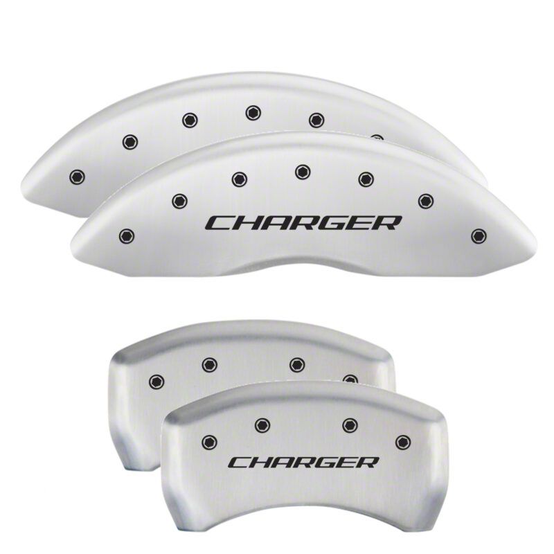 MGP Brake Caliper Covers with Charger Logo; White; Front and Rear (11-23 Charger R/T, SXT w/ Dual Piston Front Calipers; 15-17 AWD Charger SE w/ Dual Piston Front Calipers; 18-20 Charger Daytona, GT w/ Dual Piston Front Calipers)Find parts that fit my vehicle