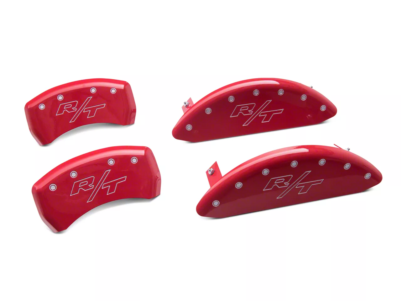 Resilient Build Quality. MGP Red Front & Rear Caliper Covers with Vintage Style R/T Logo are constructed from aircraft-grade 6061-T6 aluminum, for strength and corrosion-resistance. A strong powder-coat finish in bright red is then applied on the covers giving them their dynamic styling. Finally, a vintage style R/T logo and “bolts” are embossed onto the cover preventing premature fading.