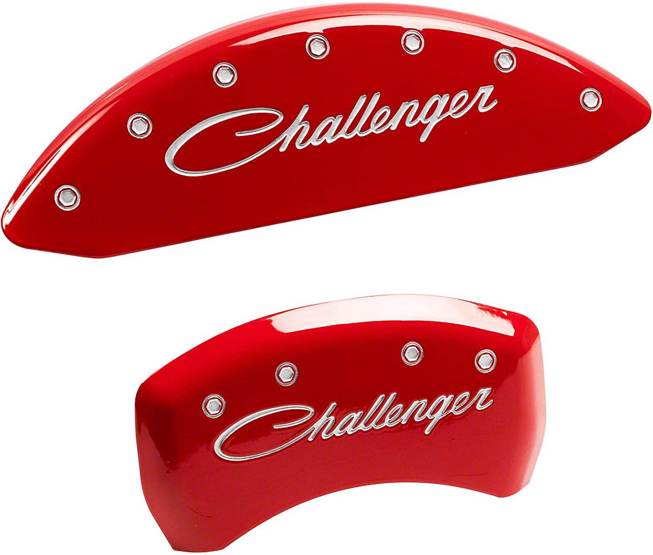 Description. Disc Brake Caliper Cover; Set of 4 caliper covers, Engraved Front and Rear: Cursive/Challenger, Red powder coat finish, silver characters.