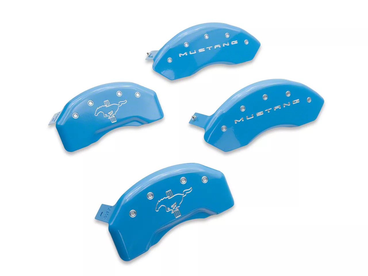 Application. The MGP Grabber Blue Caliper Covers with Tri-Bar Pony Logo - Front & Rear is designed for the 2015-2023 Standard EcoBoost, V6.