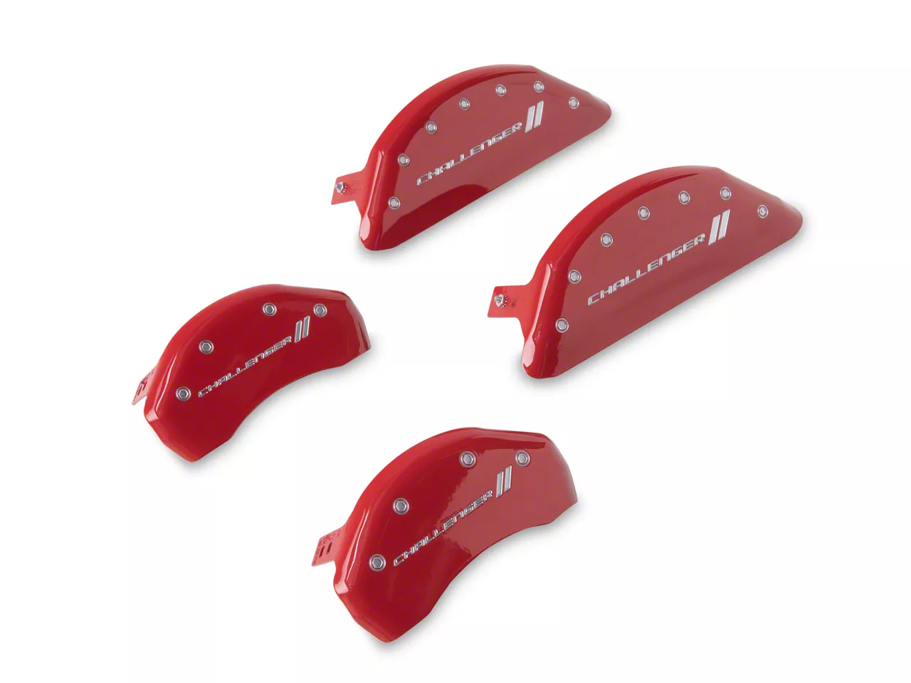 Get Custom Caliper Styling. With these MGP Red Caliper Covers featuring Challenger Stripes Logo, you get effective add-ons to effectively hide the unsightly mechanical parts that are exposed in between the spokes of the wheels. These are better alternatives to painting the calipers and are great style enhancements for your Dodge Challenger. These feature a bright red gloss powder-coat finish and a stylish silver CNC-engraved logo that give a custom styling to any vehicle.