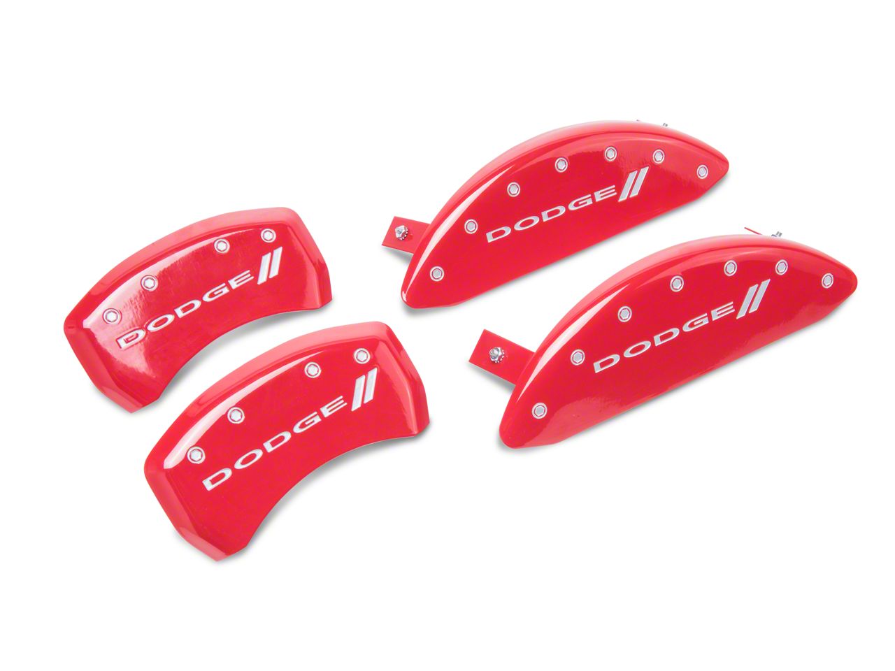 Application. The MGP Red Caliper Covers with Dodge Stripes Logo – Front and Rear are designed to fit all 2009-2010 Dodge Challenger R/T models. The covers are available for purchase as a pair for the front and rear of your vehicle. They are made in the U.S.A.