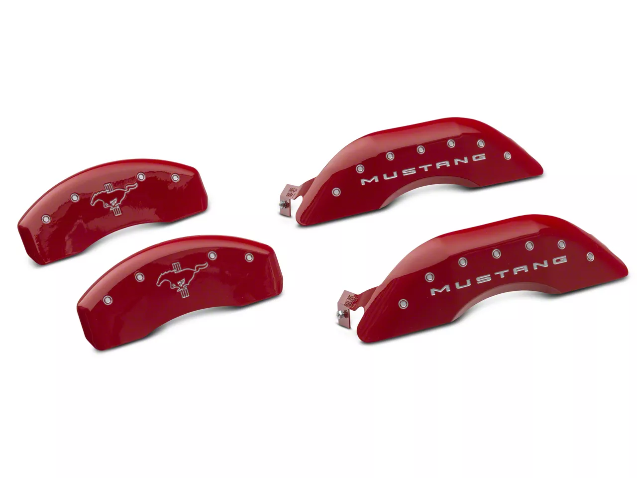 Superior Caliper Styling. Command attention of onlookers by installing the Red MGP Caliper Covers with Tri-Bar Pony Logo designed to give a distinctive big brake appearance. This set of front and rear caliper covers come with a Tri-Bar Pony logo embossed on them which adds a custom touch to your braking.