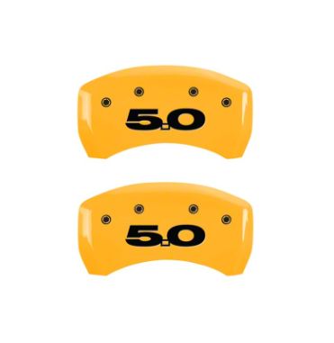 Enhanced Curbside Look. Installing these MGP Yellow Caliper Covers with 5.0 Logo on your Ford Mustang GT’s rear brakes make for an easy upgrade to your car's curbside appeal. These caliper covers feature a CNC-engraved logo on a bright yellow finish. The black overlay perfectly contrasts with the background for that striking look. With such elegance, these covers will help hide the imperfections of your aging brake calipers while giving your wheels a style upgraded.