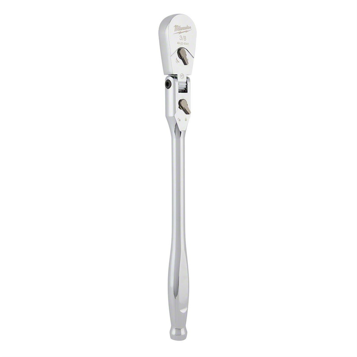 The MILWAUKEE® 3/8” Drive 12” Flex Head Ratchet with a 4? arc swing provides better access and is more adaptable to working in spaces with different angles. The ratchet head can flex to 9 different positions and has a lever to lock the head in place. The extended handle length offers increased leverage for stubborn nuts and bolts, a slim profile design, and a flush directional lever for better accessibility. The all-chrome finish makes cleaning the extended-reach ratchet easy. This ratchet is backed by Milwaukee's Mechanics Hand Tools Lifetime Guarantee.
