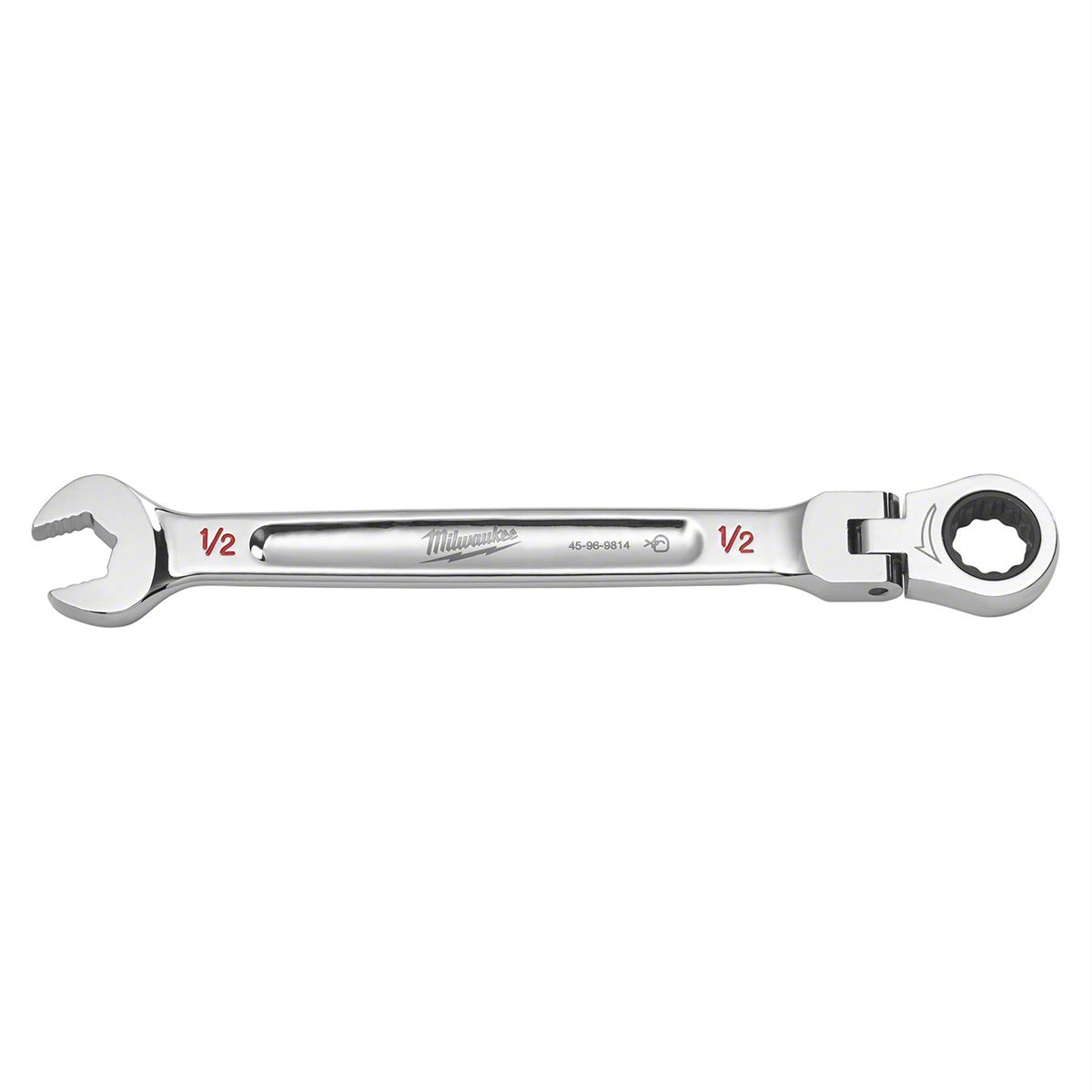 The SAE Flex Head Ratcheting Combination Wrenches feature 2.5 degrees of arc swing and 144 ratcheting positions, allowing quick and efficient work in tight spaces. The flex head wrenches have double-stacked pawls within the ratcheting mechanism, which increases durability and extends the life of the tools. The flexible head gives you increased accessibility in difficult-to-reach areas. The MAXBITE Open-End Grip improves the wrench's grip on nuts and bolts, offering you 25% more torque than smooth-faced wrenches. This flex head wrench features ergonomic I-Beam handles designed for improved comfort and ink-filled size labels for easy size identification and quick distinction between SAE and metric sets. MILWAUKEE combination wrenches feature a lifetime guarantee.