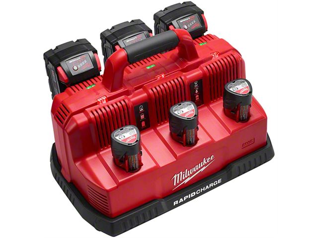 The M18™ & M12™ Rapid Charge Station is the fastest charging solution in the industry. With the ability to Charge 6 Packs 4X Faster, the station charges three batteries simultaneously while charging each pack up to 40% faster. The charger accepts up to (3) M18™ & (3) M12™ battery packs, reducing the amount of time spent changing out batteries and increasing productivity on the jobsite. Featuring REDLINK™ Intelligence, it communicates directly with the battery to monitor cell voltage, temperature, and charge status to optimize the performance and extend the life of the pack. The station has integrated hang holes for vertical mounting, a pass through plug to conserve outlet space, and a convenient carry handle to transport packs on and off the jobsite.