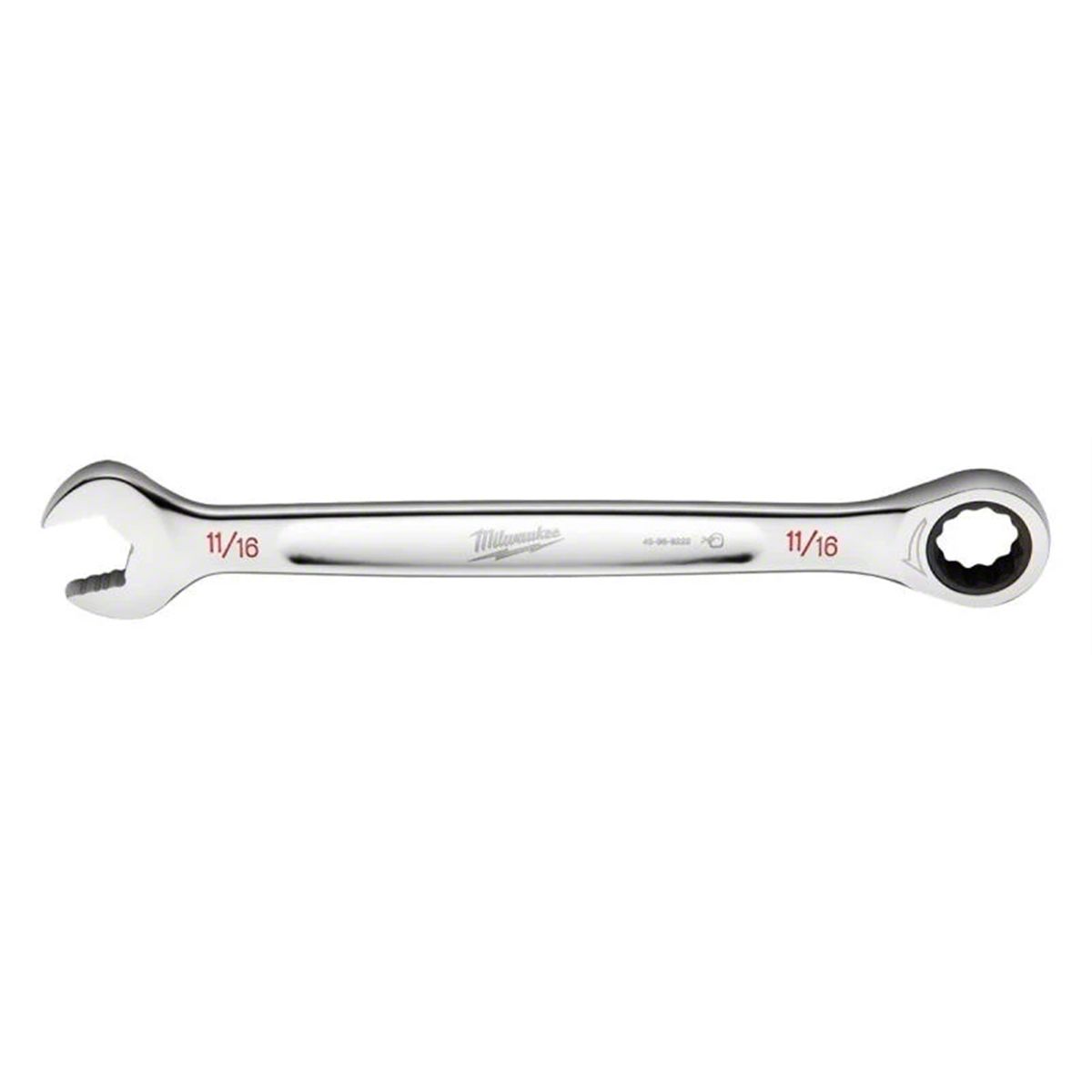 The SAE Ratcheting Combination Wrenches feature 2.5 degrees of arc swing and 144 ratcheting positions, allowing quick and efficient work in tight spaces. Our ratcheting wrench has double-stacked pawls within the ratcheting mechanism, which increases durability and extends the life of the tool. Our MAXBITE Open-End Grip improves the wrench's grip on nuts and bolts, offering 25% more torque than smooth-faced wrenches. The combination wrench features an ergonomic I-Beam handle design for improved comfort and ink-filled size labels for easy size identification and quick distinction between SAE and metric sets. The MILWAUKEE SAE wrench sizes range from 1/4" to 1-1/4" and are backed by our Lifetime Guarantee.