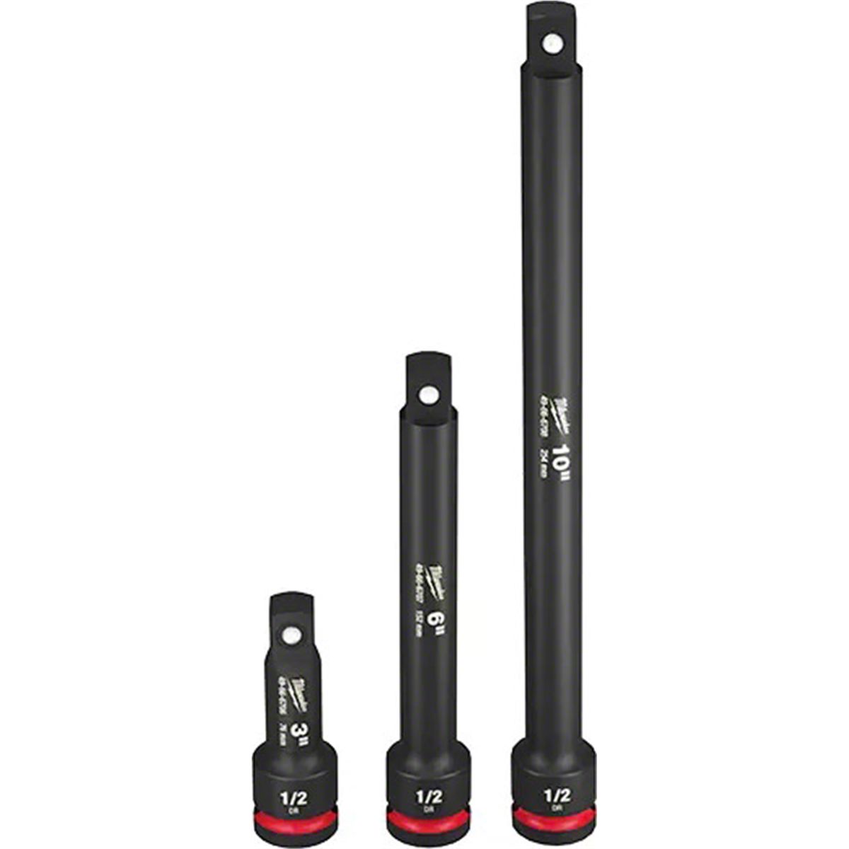 The MILWAUKEE® 4-Piece SHOCKWAVE Impact Duty™ 1/2" Drive Extension Set provides better access in hard to reach places and offers extreme impact durability in high torque applications. The laser-etched size markings allow for fast identification of drive size and length. The dual-hole design and ring groove allow for easy attachment and removal of the extensions. All SHOCKWAVE Impact Duty™ Socket Extensions are backed by a Lifetime Guarantee and meet ASME industry standards.