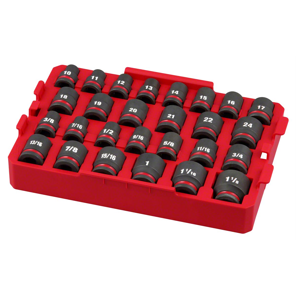 MILWAUKEE® SHOCKWAVE Impact Duty™ Socket Set features the boldest, longest lasting markings and extreme impact durability in high torque applications. The stamped and ink filled size marking enables you to select the right socket every time throughout the life of the socket. Engineered with high strength forged steel for optimized performance in heavy duty applications. Milwaukee socket sets feature removable trays that are compatible with MILWAUKEE® PACKOUT(TM) Organizers and fit in tool chest drawers. The non-slip hex geometry prevents fastener rounding. The Milwaukee dual hole design and ring groove allows for easy socket attachment and removal. The cases are impact resistant and nest together for easy stacking and storage. All Milwaukee SHOCKWAVE Impact Duty ™ Sockets and Extensions are backed by Milwaukee's Lifetime Guarantee and meet ASME industry standards.