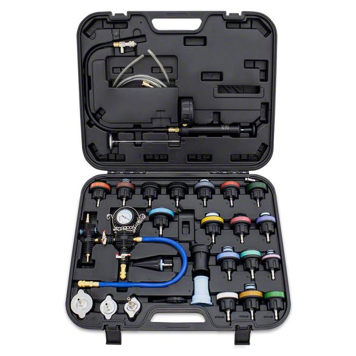 Comprehensive and Reliable. Constructed with durability in mind, this kit includes a variety of adapters to fit a wide range of vehicles, making it versatile for multiple applications. It's an essential kit for quickly finding system leaks and refilling the cooling system without introducing air pockets, promoting vehicle health and longevity.