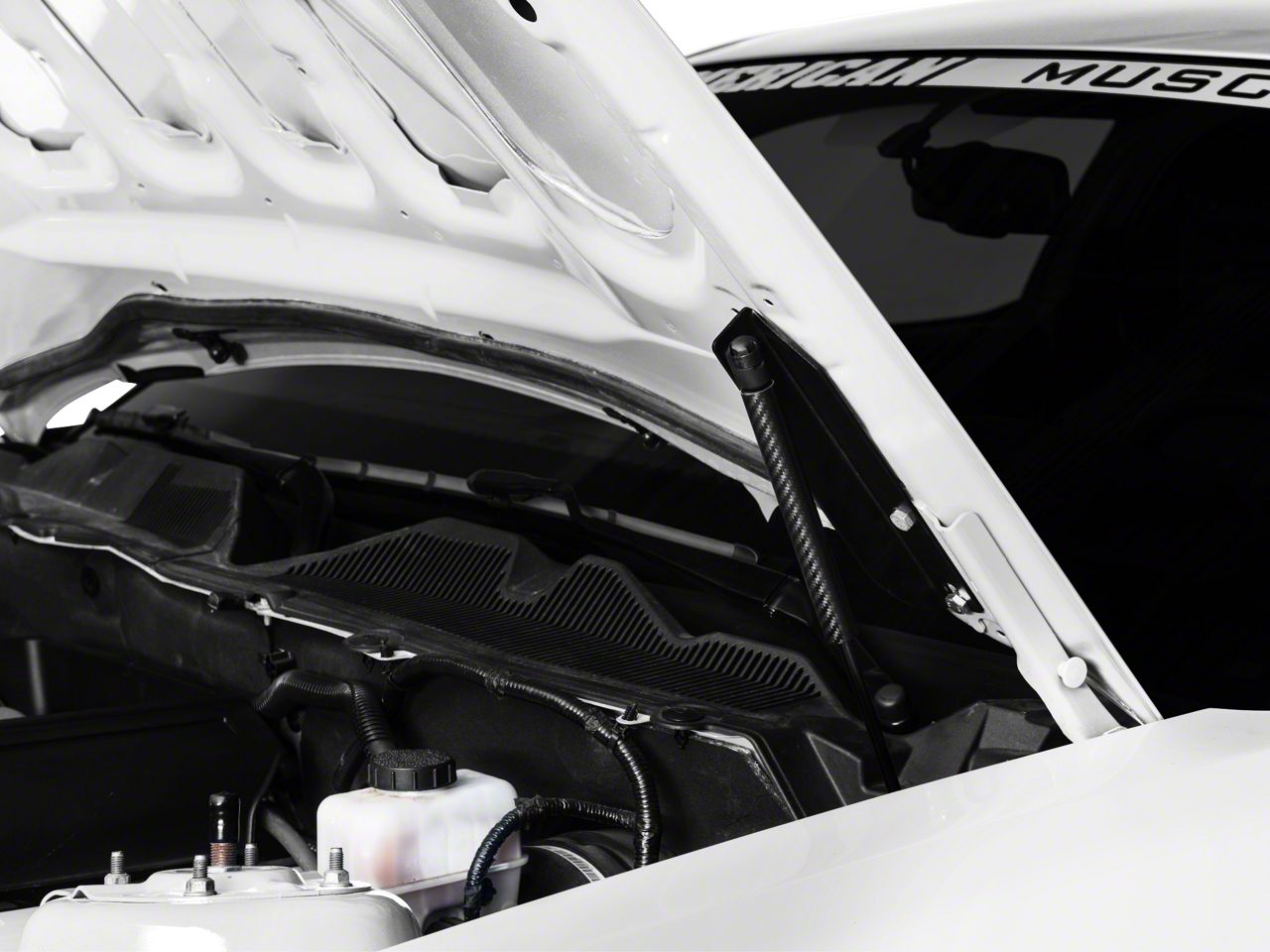 Style And Strength. Designed to get rid of that old ugly prop rod, this set of two powerful yet sleek MMD gas struts not only makes opening your Pony's hood much easier, but also holds it securely in place. Made from lightweight steel and aluminum, they feature a carbon fiber appearance to give your engine bay race inspired styling.